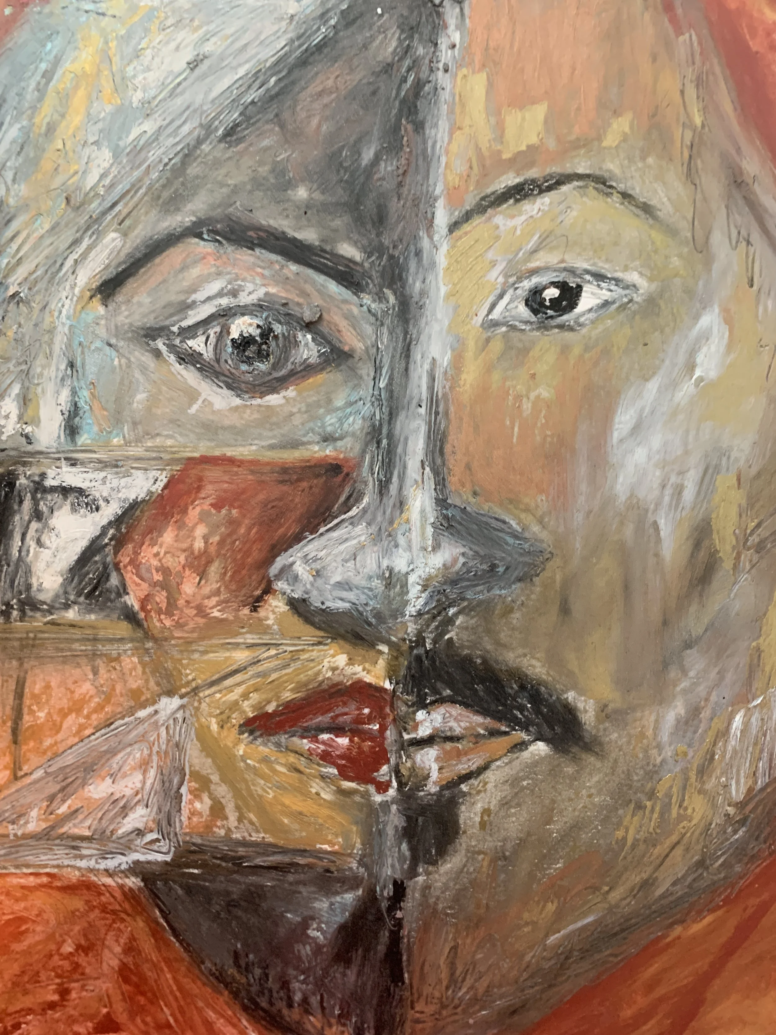 A psychological study of identity and duality. This work utilizes a cubist-inspired split perspective to explore the multi-faceted nature of the human persona, balancing earthy tones with expressive, textured brushwork. The split perspective reflects a life lived across linguistic and cultural borders.